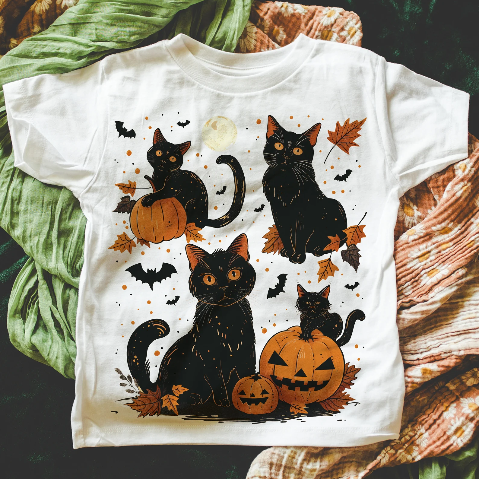 A fun and spooky Halloween-themed T-shirt design featuring a sleek black cat playfully sitting inside a carved pumpkin with a glowing smile. The cat’s bright yellow eyes add a touch of mystery, while the pumpkin’s warm glow contrasts against a dark background with subtle hints of autumn leaves and a crescent moon. Perfect for cat lovers and Halloween enthusiasts alike, this design captures a whimsical and festive spirit.